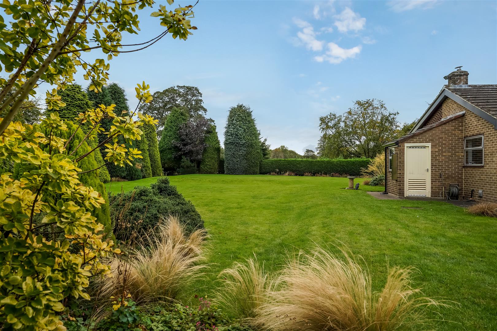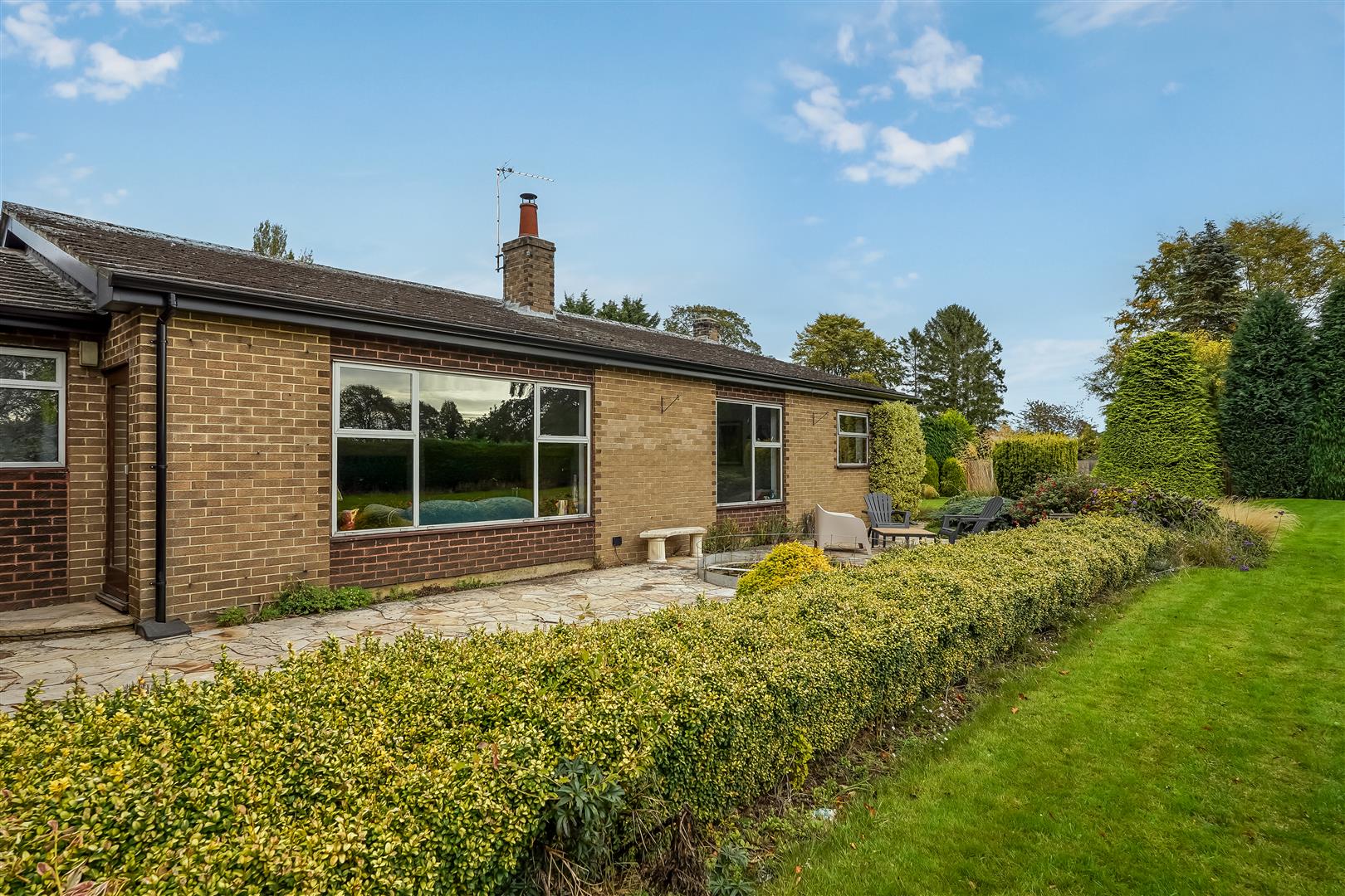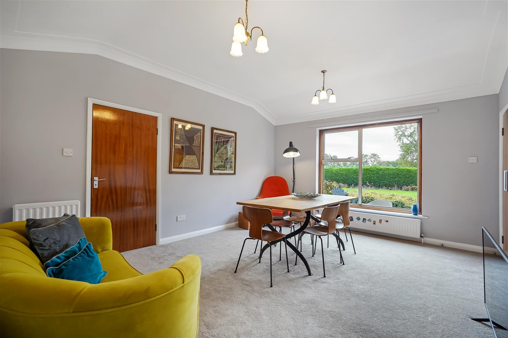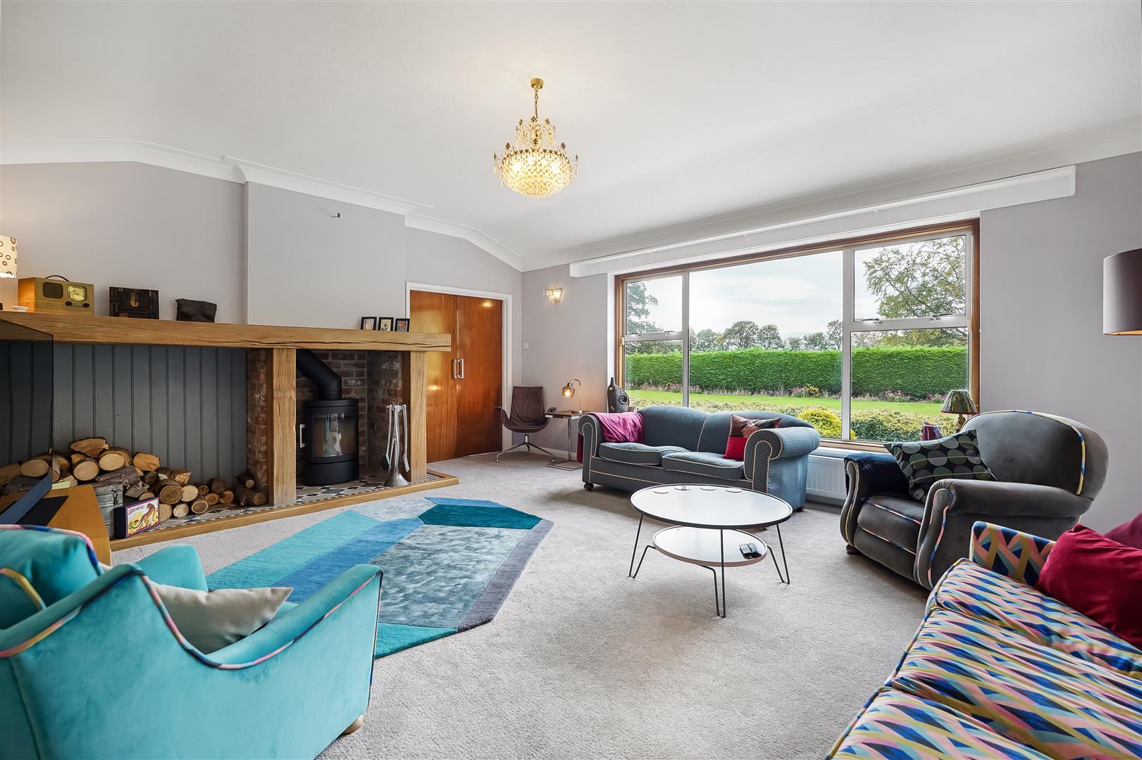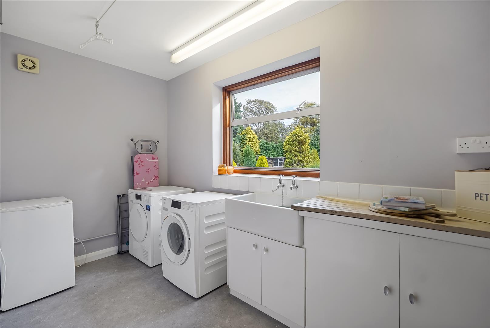 Internal accommodation consists of an entrance lobby leading to a spacious hallway/reception room, relaxing living room with huge windows and solid fuel fire and huge windows overlooking the expansive landscaped gardens, south facing patio area and fish pond. The adjacent dining room leads to a vintage style kitchen, utility room, pantry, WC and boiler room complete the east side of the home.