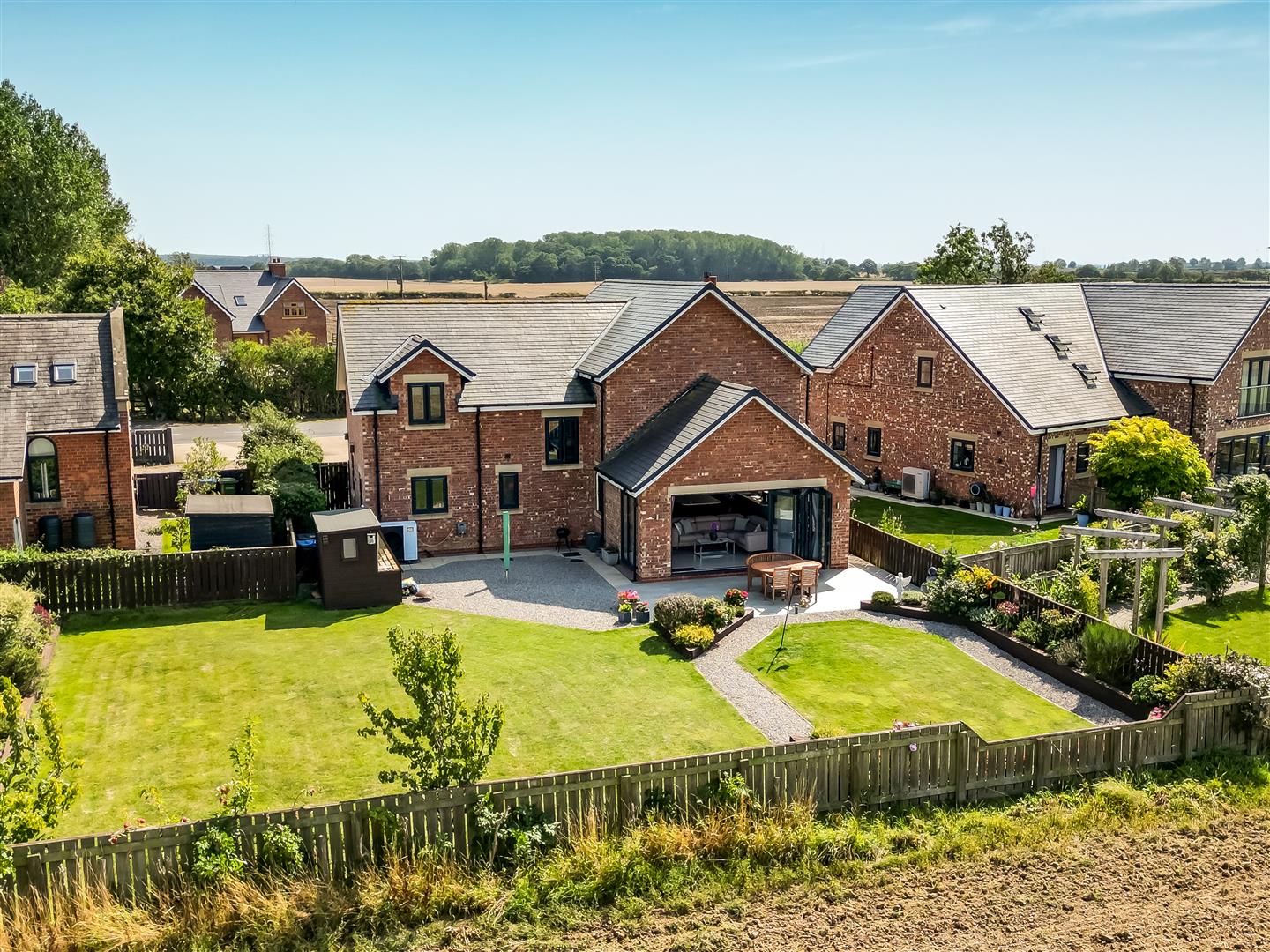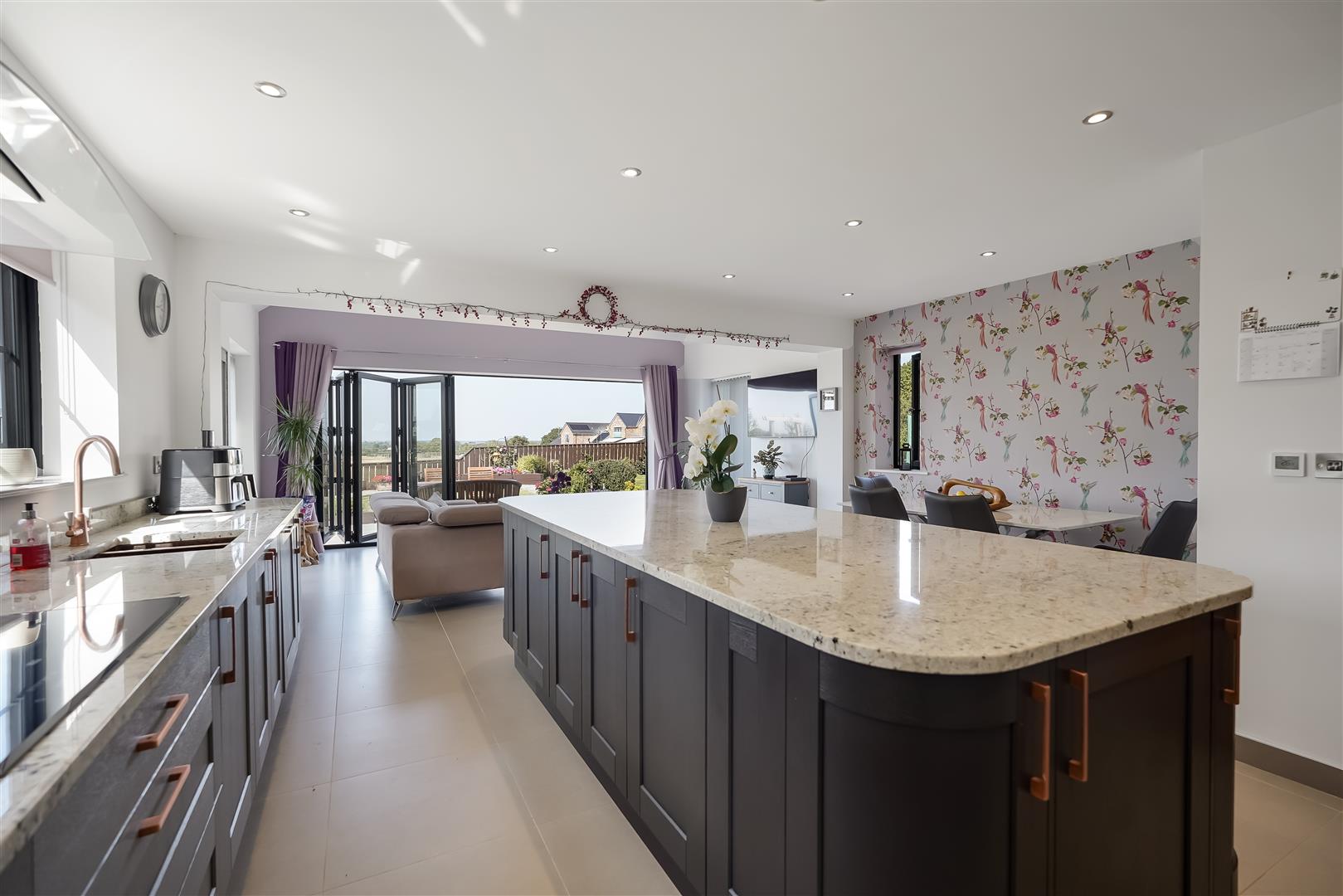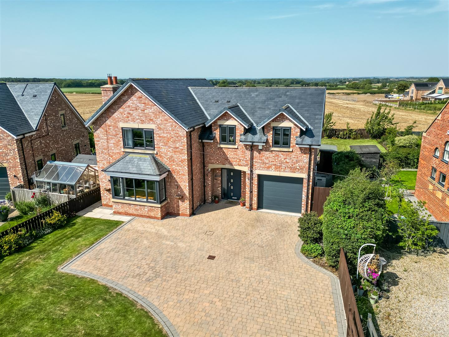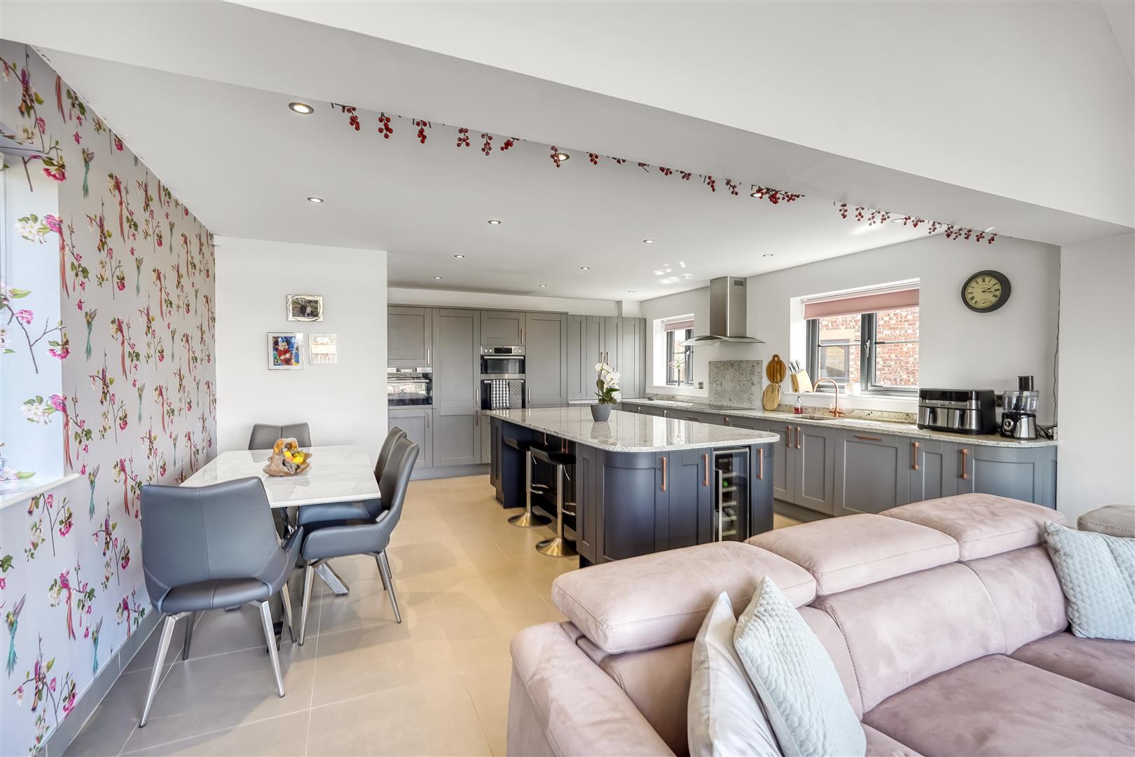 An exceptional four bedroomed detached family home providing modern open plan living accommodation adjoining open countryside with lovely views to the rear. Constructed to a high specification the property benefits from under floor heating to the ground floor and radiators to the first floor via air source heat pump and Upvc double glazing. The accommodation includes a spacious reception hall, cloaks/wc, storage cupboard, spacious living room with log burning stove, stunning open plan kitchen/dining/family room with bi folding doors opening to the rear patio and garden. The kitchen area is fitted with a large island, granite work tops and integrated double oven, microwave, fridge, freezer, dishwasher, wine cooler and induction hob with extractor canopy. From the first floor landing, there is a master bedroom with fitted wardrobes and a luxury en suite shower room, the guest bedroom also has fitted wardrobes and a luxury ensuite shower room. There are two further bedrooms and a luxury family bathroom. Externally there is a gated block paved driveway providing off street parking and access to the integral garage with remote door and pedestrian door to the main reception hall. There is a lovely landscaped rear garden with patio and lawn adjoining open countryside with far reaching views.