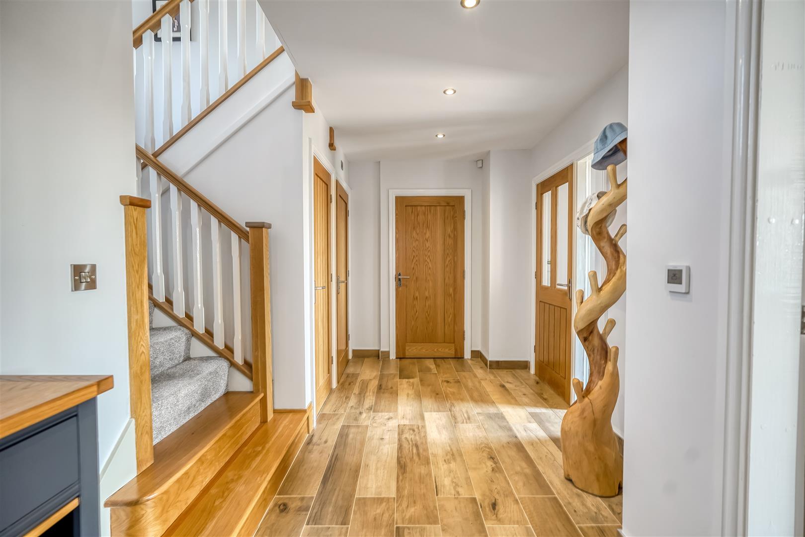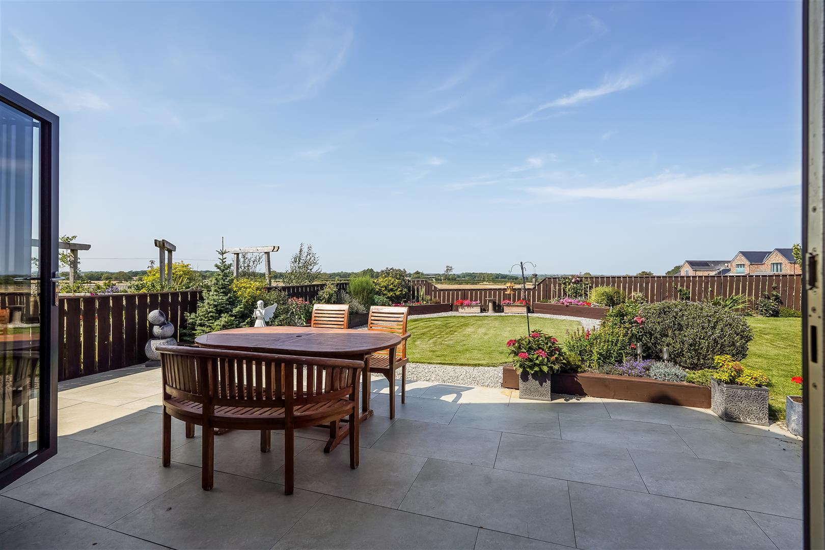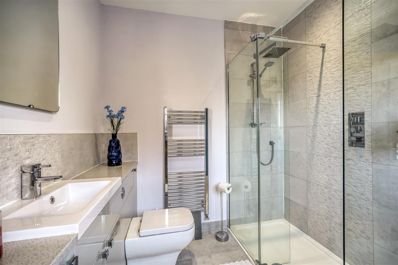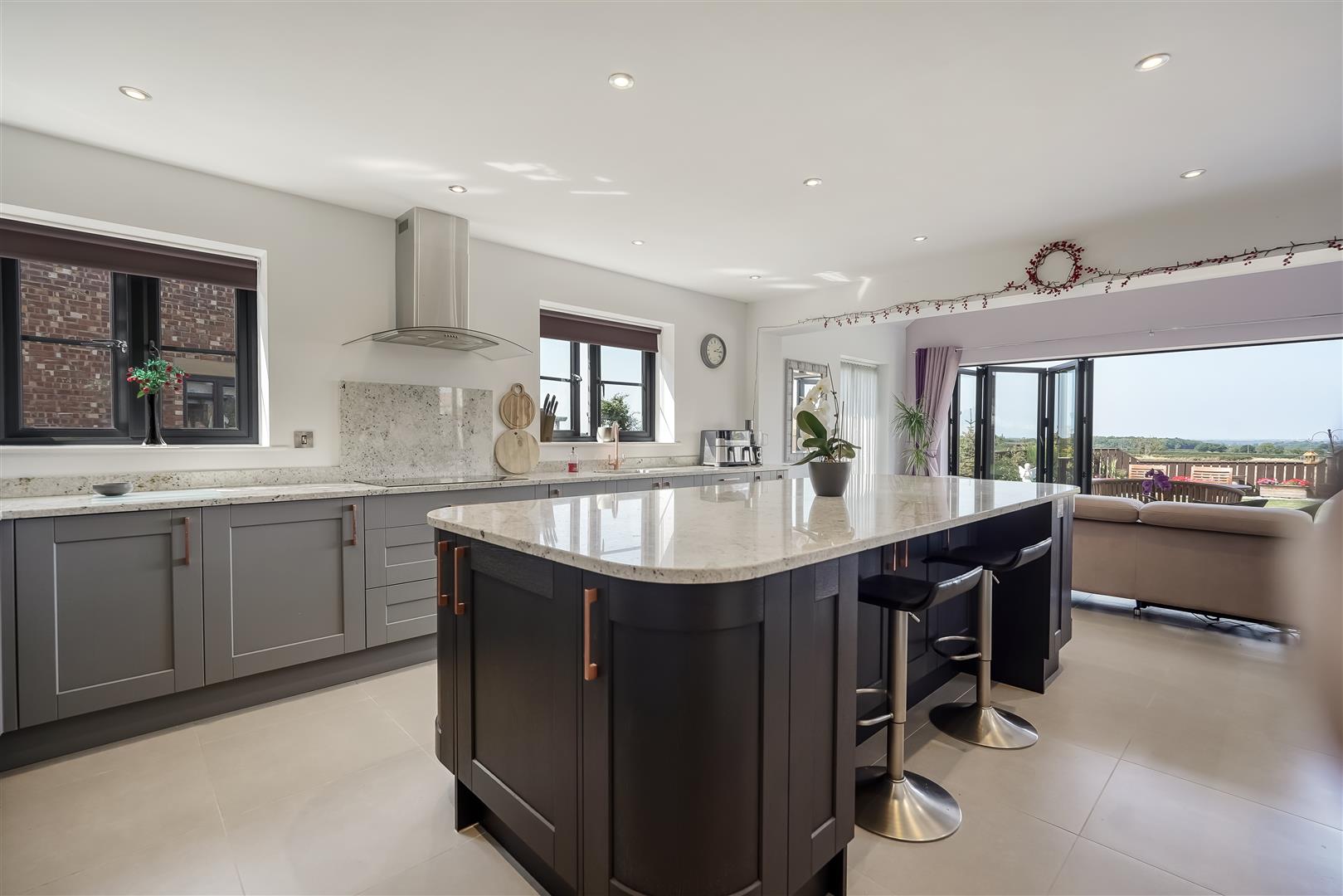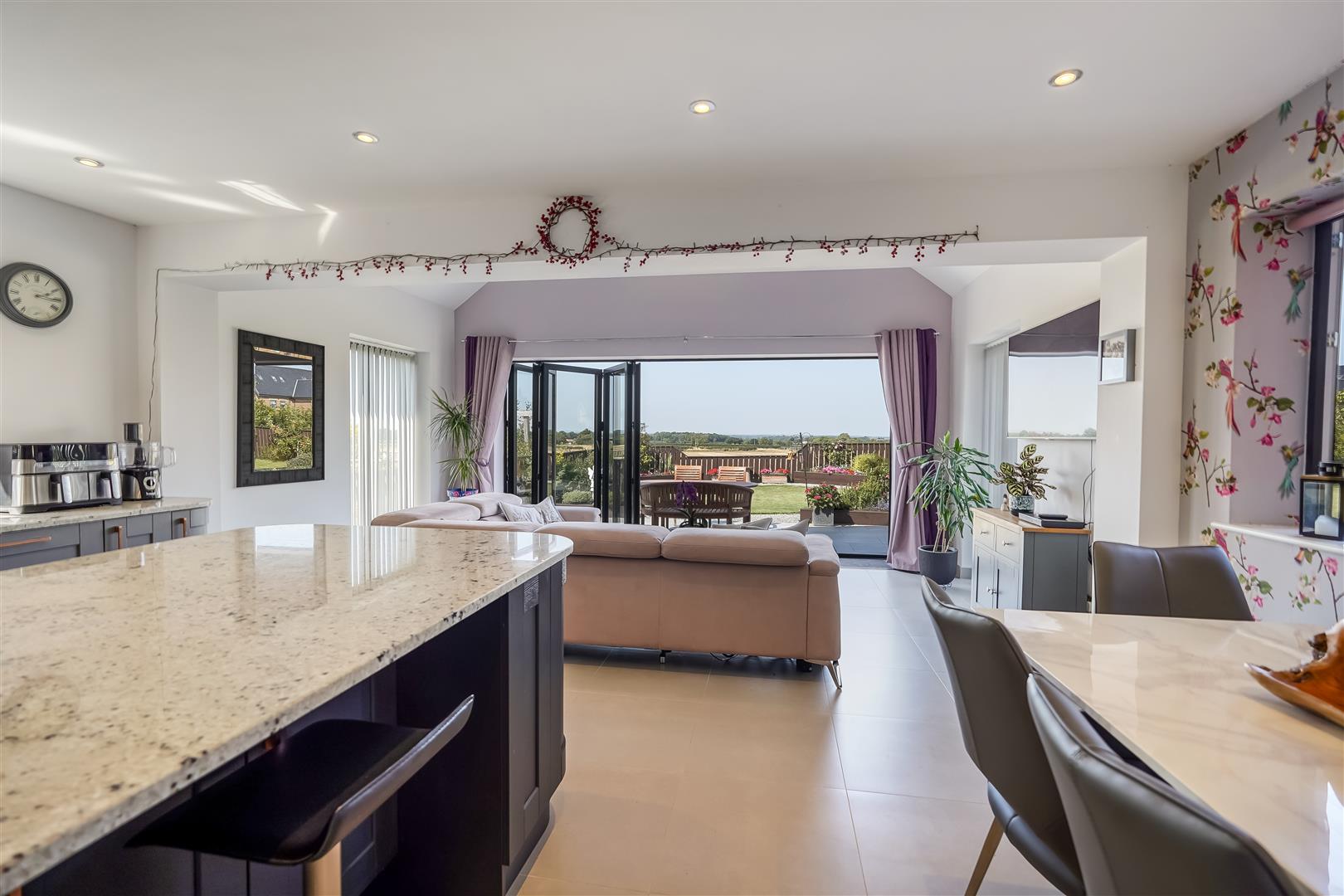 An exceptional four bedroomed detached family home providing modern open plan living accommodation adjoining open countryside with lovely views to the rear. Constructed to a high specification the property benefits from under floor heating to the ground floor and radiators to the first floor via air source heat pump and Upvc double glazing. The accommodation includes a spacious reception hall, cloaks/wc, storage cupboard, spacious living room with log burning stove, stunning open plan kitchen/dining/family room with bi folding doors opening to the rear patio and garden. The kitchen area is fitted with a large island, granite work tops and integrated double oven, microwave, fridge, freezer, dishwasher, wine cooler and induction hob with extractor canopy. From the first floor landing, there is a master bedroom with fitted wardrobes and a luxury en suite shower room, the guest bedroom also has fitted wardrobes and a luxury ensuite shower room. There are two further bedrooms and a luxury family bathroom. Externally there is a gated block paved driveway providing off street parking and access to the integral garage with remote door and pedestrian door to the main reception hall. There is a lovely landscaped rear garden with patio and lawn adjoining open countryside with far reaching views.