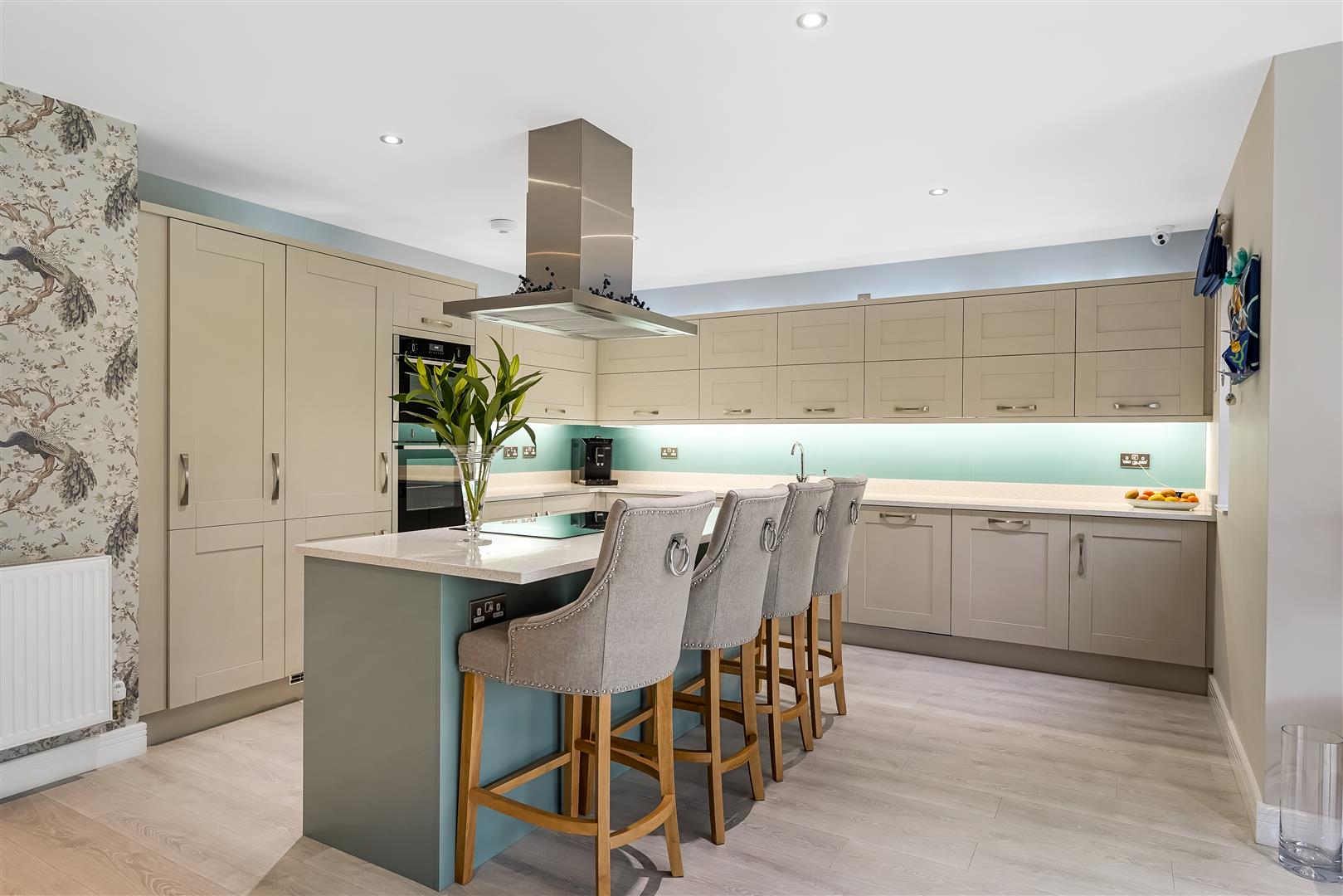 Inside, the property is finished to a high standard with a Sheraton kitchen, NEFF appliances, Porcelanosa tiling, and fittings by Villeroy & Boch and Hansgrohe. The spacious layout includes a sun room, open-plan kitchen/dining/family area, a log-burning stove in the main living room, and a second reception room ideal as a snug or study.