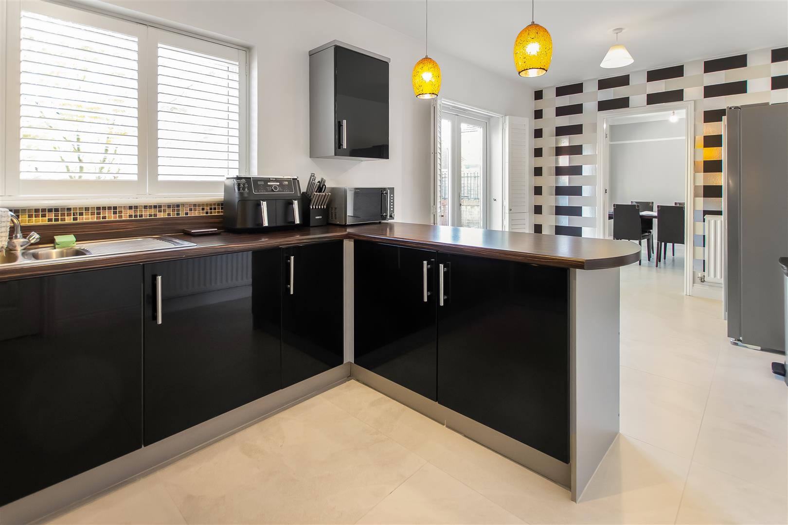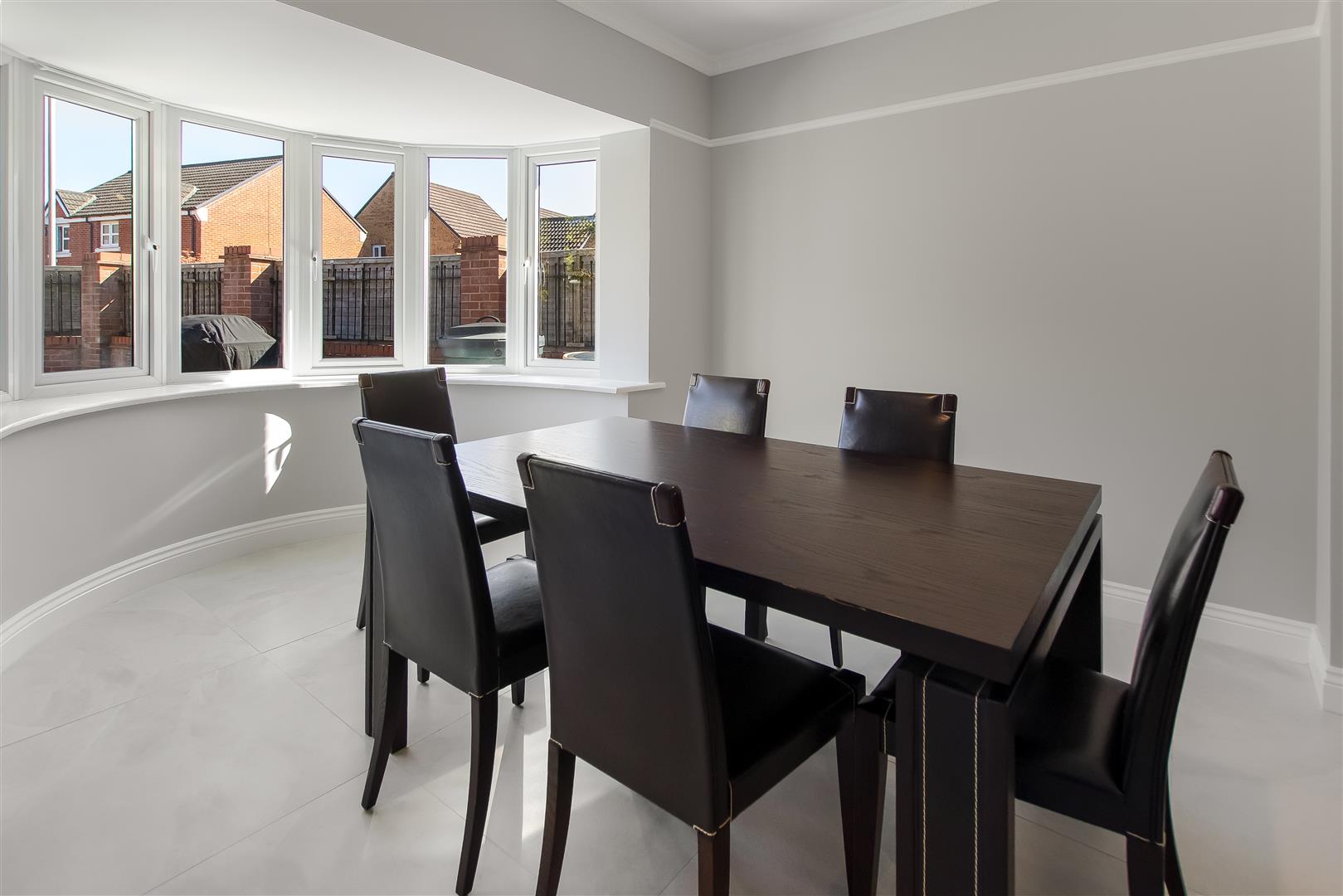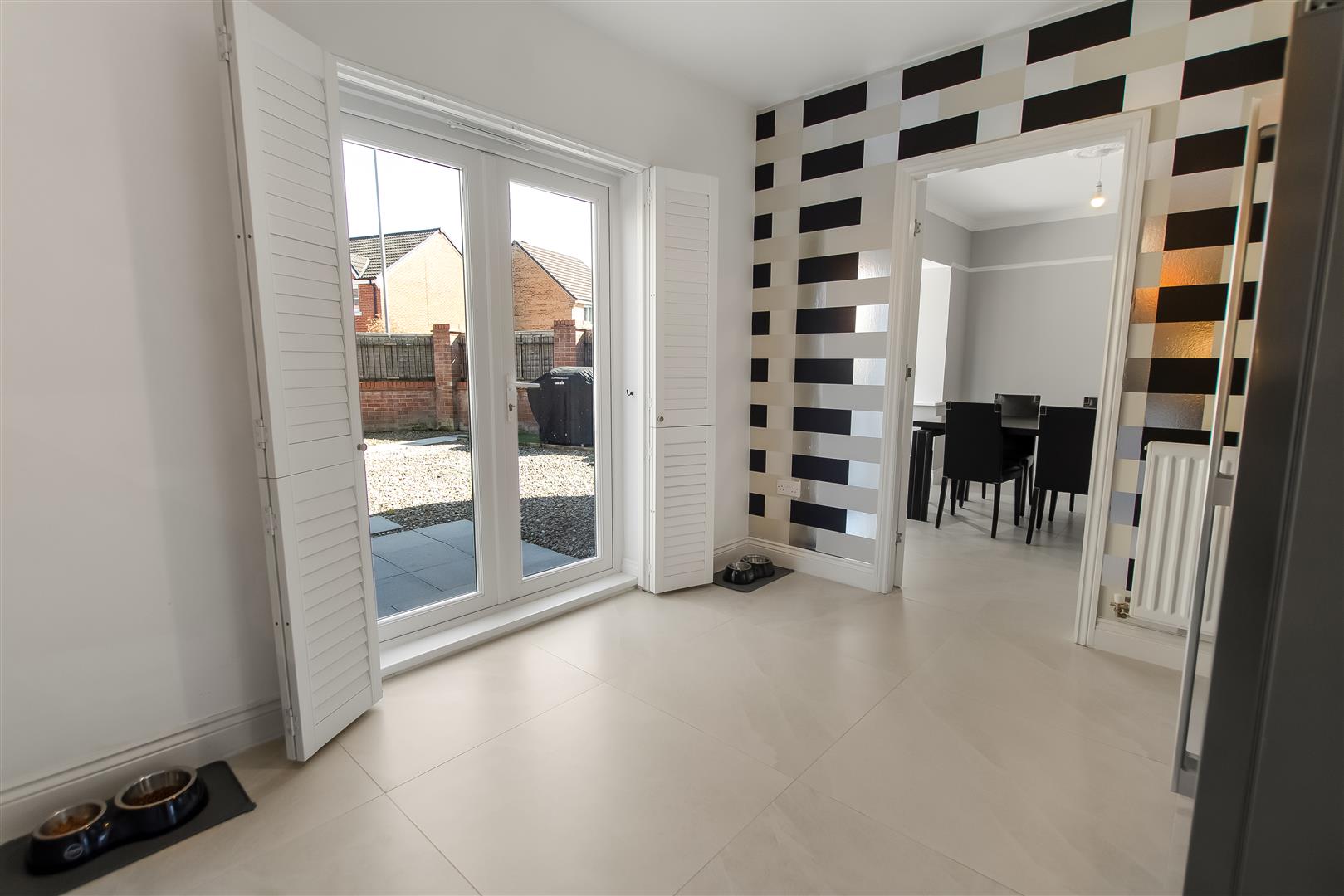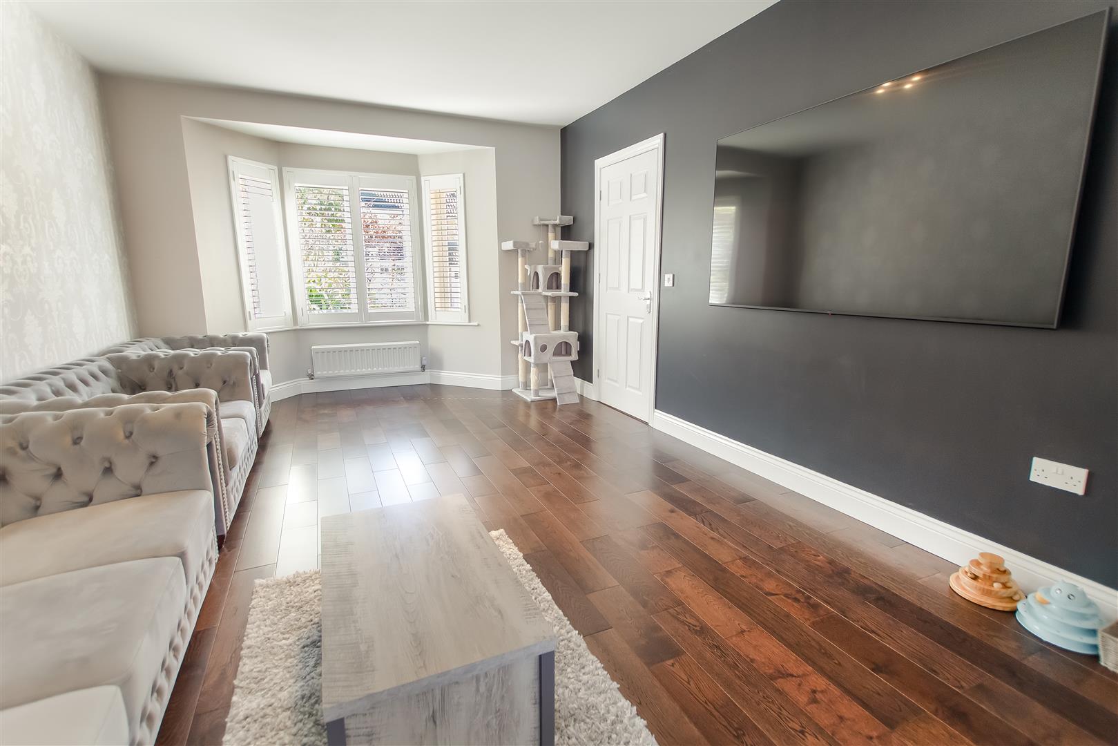 As you enter, you are greeted by an inviting and spacious hallway featuring a striking return staircase and porcelain tiled floor which continues to the kitchen/beakfast room, utility and dining room. The ground floor includes two reception rooms, with a bay-windowed lounge that flows seamlessly into the dining room, which is enhanced by a charming walk-in bay at the rear. The sizeable fitted kitchen/breakfast room is a true highlight, complete with French doors that lead to the enclosed rear garden, making it an ideal space for entertaining or enjoying family meals. Additionally, a useful utility room provides internal access to the integral double garage, adding to the practicality of this home.
