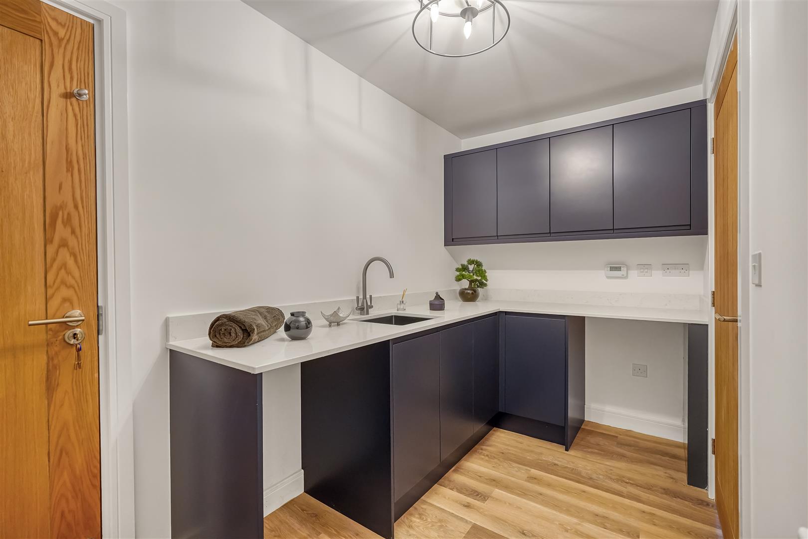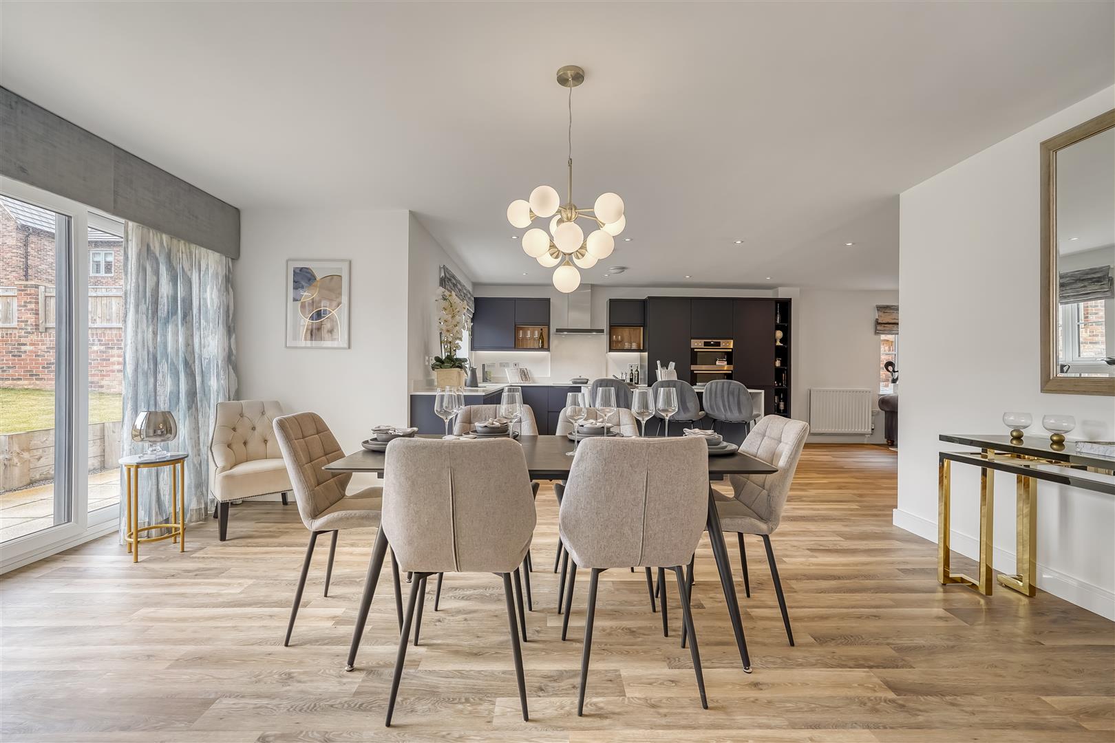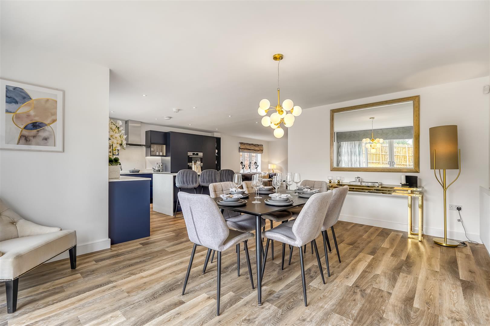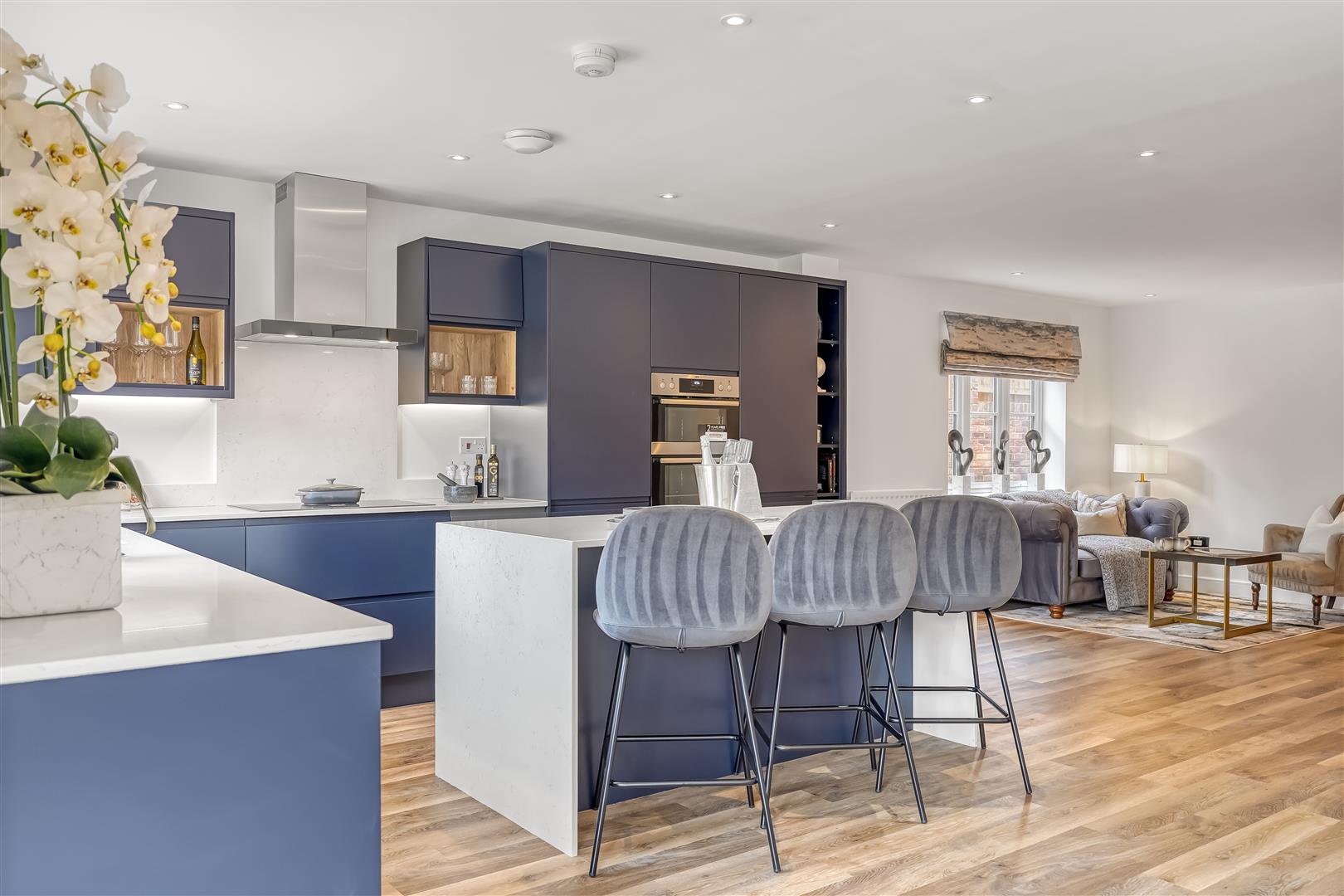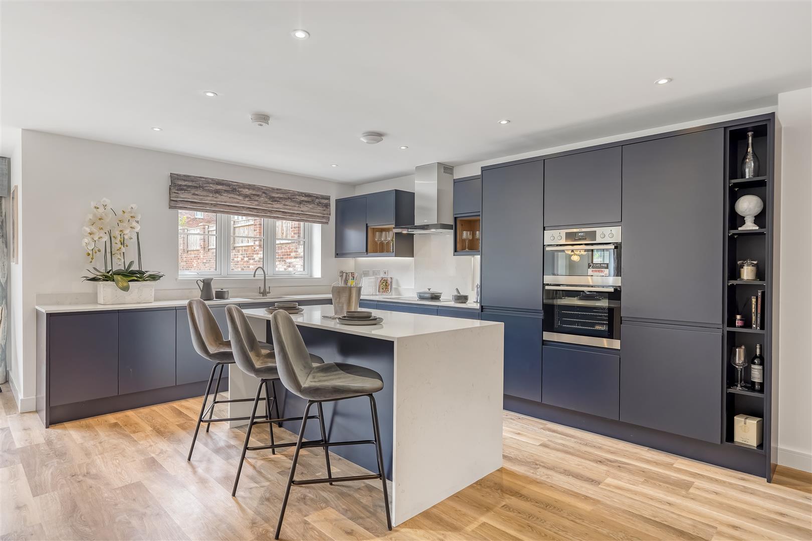 Downstairs, you'll find a spacious open-plan kitchen, dining and family area – the true hub of the home. The sleek, handleless kitchen in deep indigo gives it a contemporary edge, while large sliding doors open directly onto the garden, bringing the outside in and flooding the space with natural light.