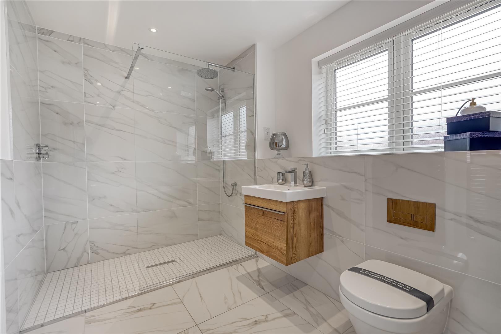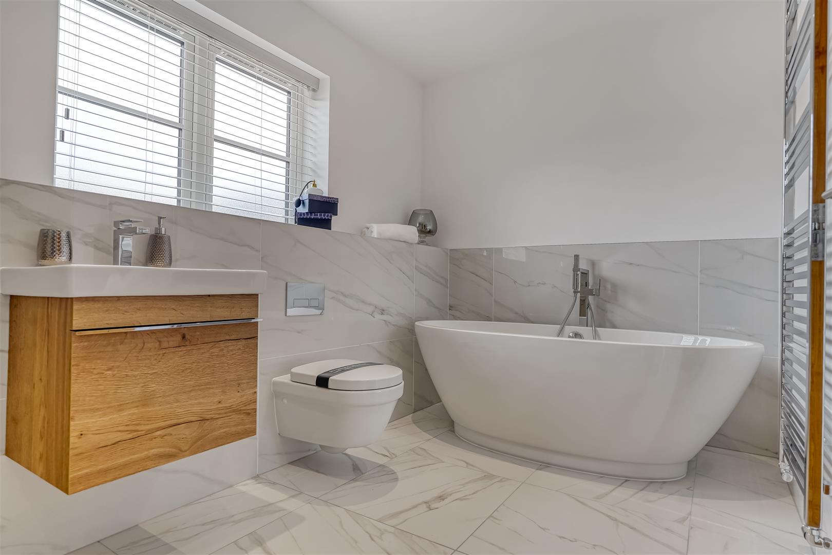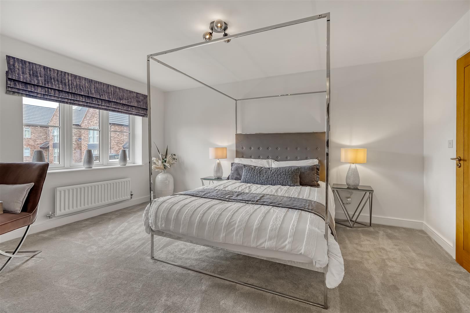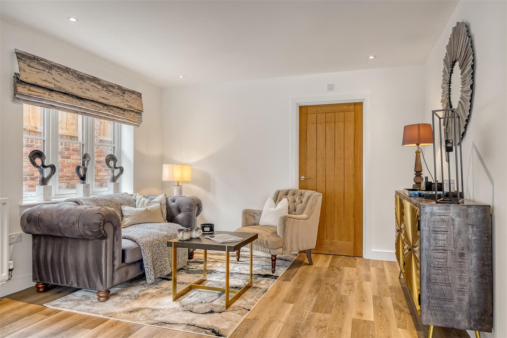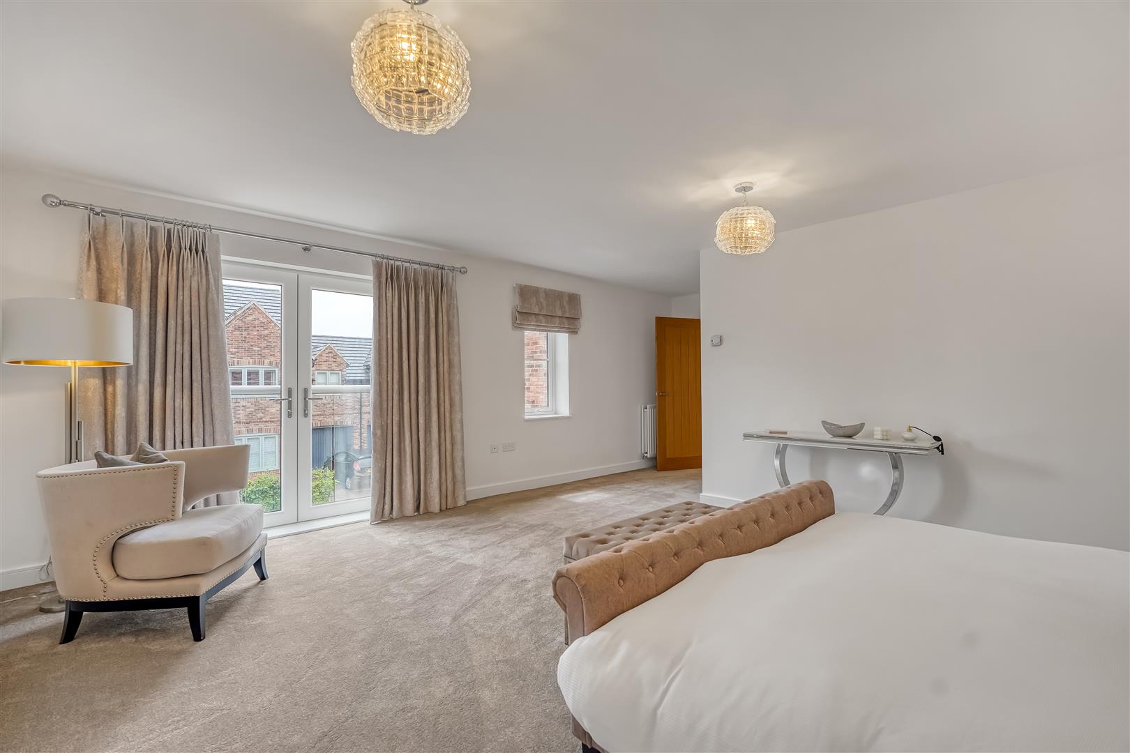 Upstairs, the galleried landing leads to a luxurious main bedroom complete with Juliet balcony, walk-in wardrobe, and a stylish en-suite. A second double bedroom also benefits from its own en-suite, and there are two further doubles along with a beautifully finished family bathroom, featuring a freestanding bath and walk-in shower.