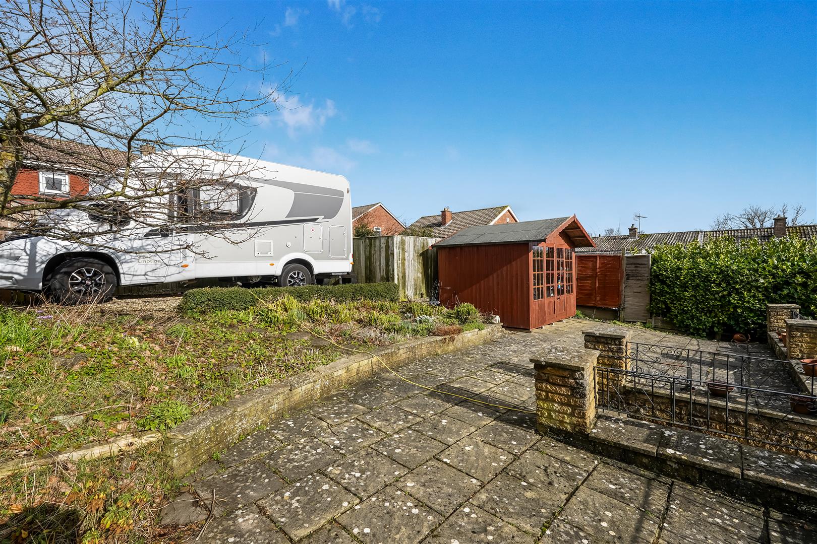 The single garage has an electric door, power points, and a side door leading into the rear garden. To the front is a private driveway, and to the rear, a generous parking area offers ample space for a motorhome or caravan, perfect for those who enjoy travel and adventure.