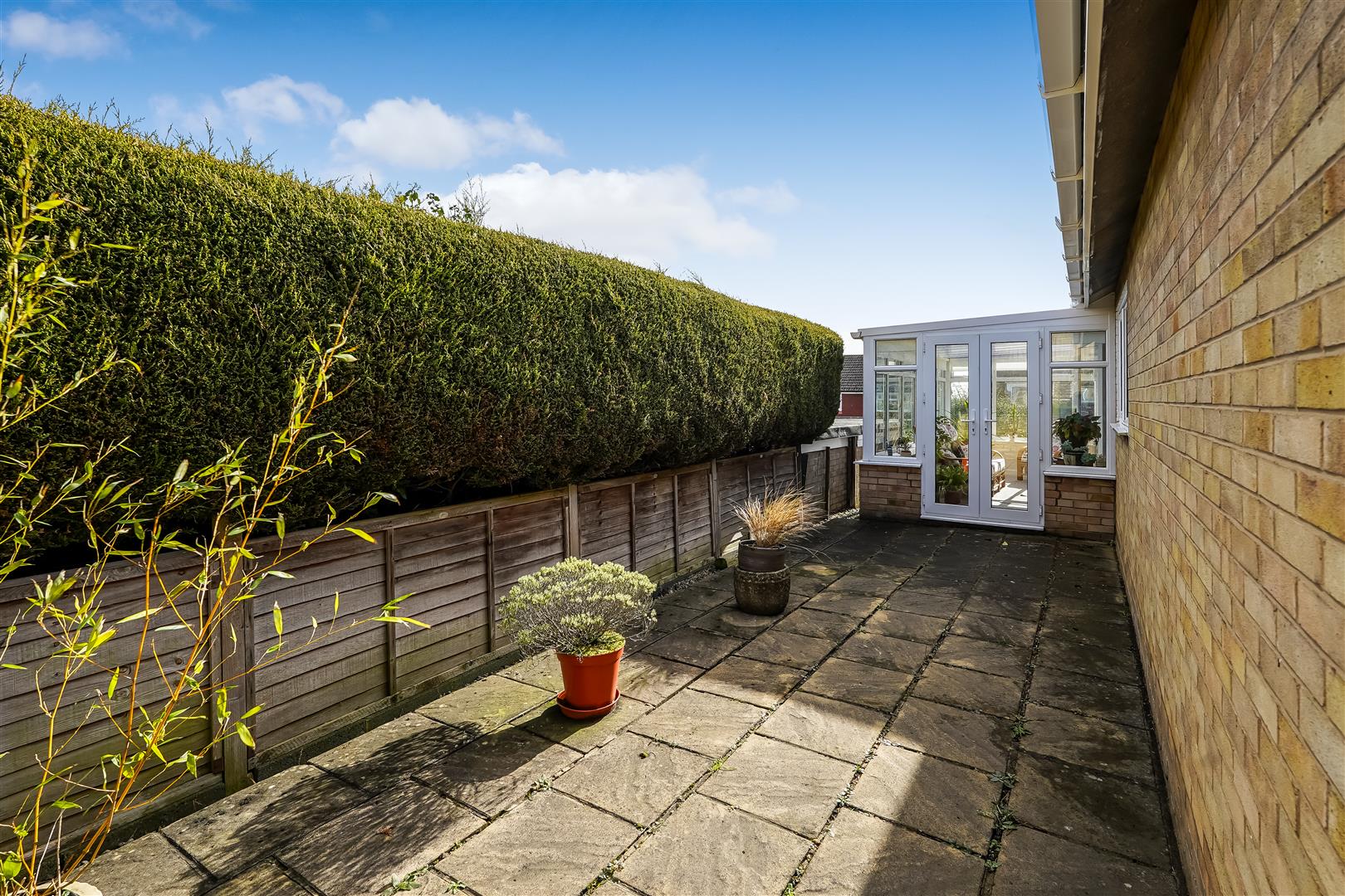 The modern kitchen has been tastefully updated with high gloss white units, contrasting worksurfaces, and tiled splashbacks, offering both style and practicality, with door to the spacious, open-plan Lounge & Dining Area flooded with natural light. A modern fireplace with marble insert, and coal-effect gas fire creates a cosy focal point. Double doors lead through to a delightful conservatory adding additional living space with double doors opening onto the side and rear patio, perfect for enjoying the garden whatever the weather.